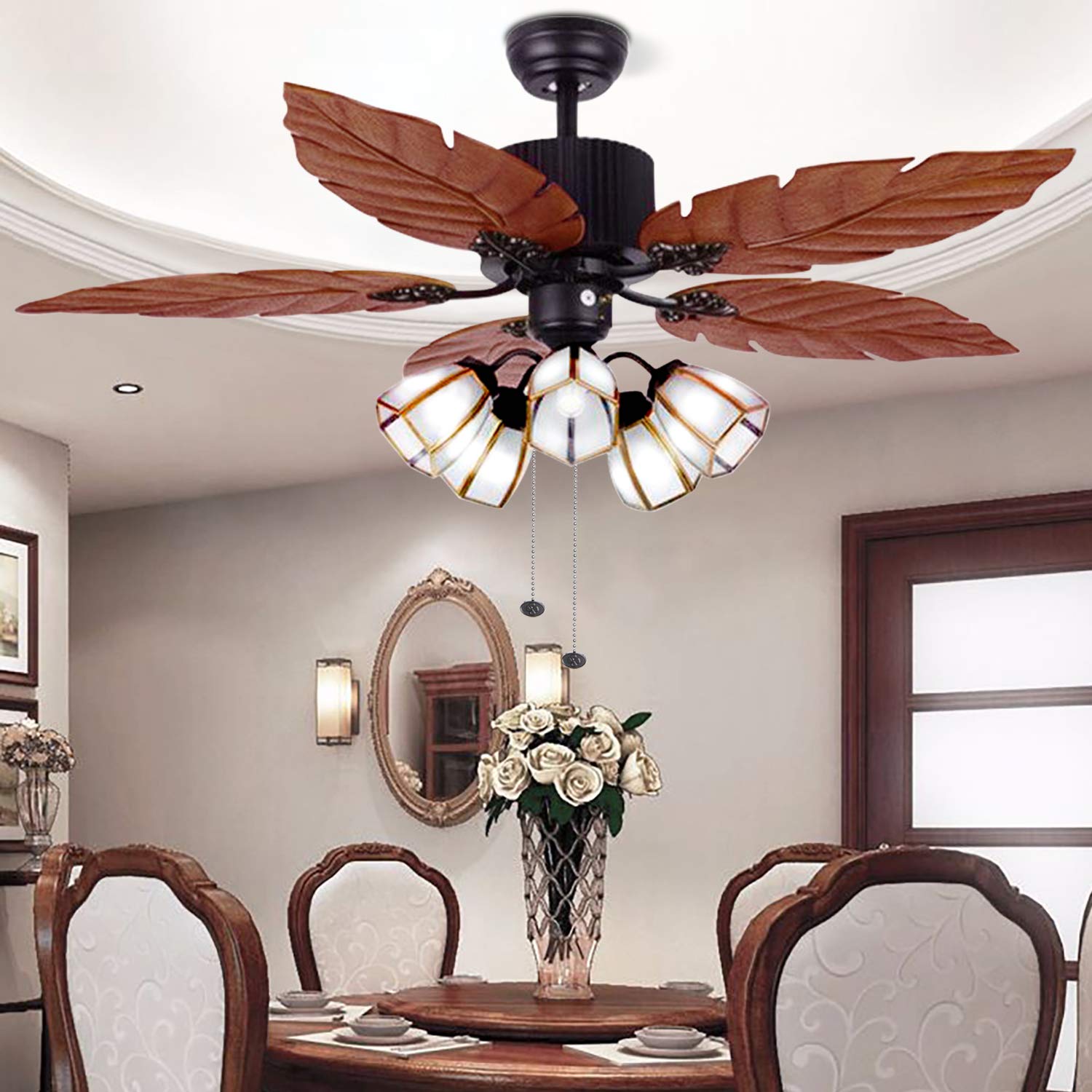 52 inch traditional style indoor/outdoor bronze ceiling fan with light kit, industrial pull chain ceiling fan with lighting, reversible. The tropical look perfectly complements our dining room furniture. This outdoor traditional fan in the roman bronze, or white finish features beautiful palm leaf blades bringing a tropical feel to any space, indoor or out. Ceiling fans without lighting can sometimes be modified with a compatible light kit if it's desired later on. Having a fan and light installed as a unit will spruce up any room while optimized for both indoor and outdoor use.